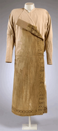 These rare spoils of Asian trade were first presented annually by Japanese shoguns to officials of the Dutch east India Company (VOC) and thereafter were made available as Western copies. By the end of the seventeenth century, similar robes made of chintz or batik, also known as banyans, were imported from India and went through the same transformation to domestic product. All of these long, loose garments possessed a novelty and cachet unmatched by more abundant imports such as spices, lacquer, porcelain, and precious metals. They appear in portraits of eminent and wealthy men, as well as in fictionalized genre images of scholars and scientists. Collectively, these garments created an idealized costume of social and intellectual prestige. Behind it are the interactions among the forces of class, fashion, fantasy, exoticism, and, above all, the extraordinary taste-making power of the VOC.