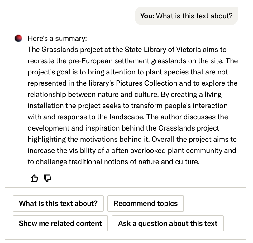 By asking questions that can be answered by the text, users receive responses only if the information is present. The conversational interface adds an accessibility layer as well, making the tool more user-friendly and tailored to the diverse needs of the JSTOR user community.